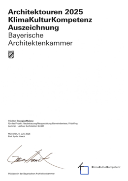 Wir freuen uns, dass das Projekt mit dem KlimaKulturKompetenz-Prädikat durch die Bayerische Architektenkammer ausgezeichnet wurde.