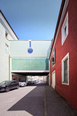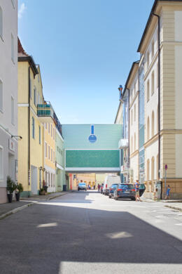 Das Hauptgebäude des Traditions-Kaufhauses Unterforsthuber am Stadtplatz ist durch einen Überbau mit dem in den 1960er Jahren erstellten Verkaufsgebäude in der Fuchsgrube verbunden.