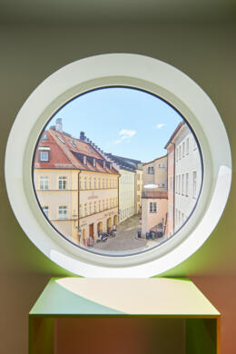 Der Blick aus den beiden runden Fenstern ermöglicht einen bemerkenswert bildhaften Ausblick in die historische Gasse hinter dem Stadtplatz.